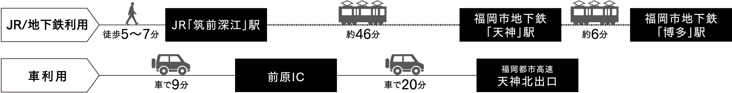 ※電車・バスの所要時間は通勤時(7:30~8:59分)です。待ち時間・乗り換え時間が含まれています。※アクセス図は概略図ですので、省略されている駅・路線等があります。(2025年4月)